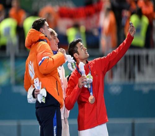 2月11日,冠军美国选手斯托尔兹(中)、亚军荷兰选手德布(左)和第三名我国选手宁忠岩在颁奖仪式上自拍。新华社记者 武巍 摄