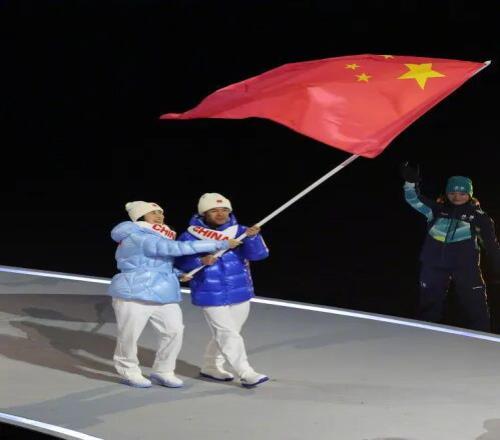 而运动员专属的红白色领奖服似乎燎原之火,既是科技工艺的体现,也暗喻着我国冰雪健儿的闪烁米兰的冬奥征途。