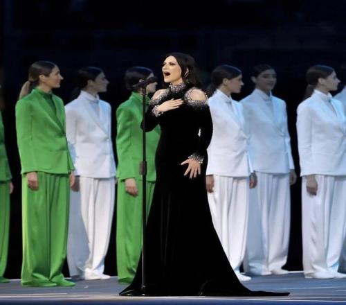 奏唱意大利国歌《马梅利之歌》时,登台的意大利女歌手Laura Pausini相同身着Giorgio Armani Privé高档定制黑色礼衣裙,展示浪漫诱人的意式风情和品牌一直不变的高雅风格。