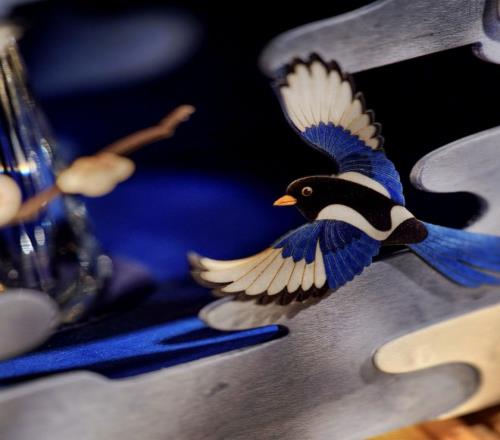 “细木镶嵌”,需求将多达130多种颜色,以及各种纹路的细小木材用作画的方法进行镶嵌,并且要确保终究出来的著作的确细腻平滑得如一副画作。