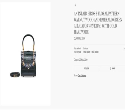 2019年,佳士得拍卖行拍出了一只端木良锦的迷你细木镶嵌手袋,预评价2-3万,终究以13.75万港元成交,让这个牌子在小范围内一战成名,被称为“我国的豪华品牌”。