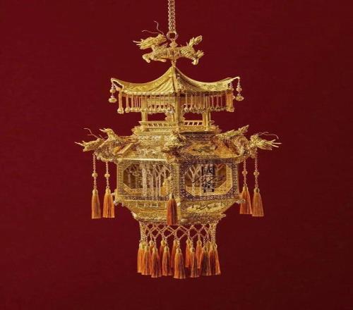 △左:国窖1573 X 花丝镶嵌非遗技艺之麒麟宫灯;右: 国窖1573 X 花丝镶嵌非遗技艺之鹤形宫灯