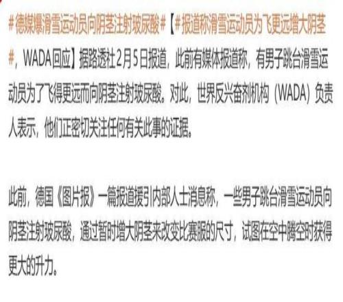 本届冬奥会才刚开始不久,但已经有了超级离谱的利诱新闻:一家名叫《图片报》的德国媒体宣称,有些男性跳台滑雪运动员正在悄悄打针玻尿酸增大阴茎,只为改动竞赛服尺度,并在竞赛中飞得更远。