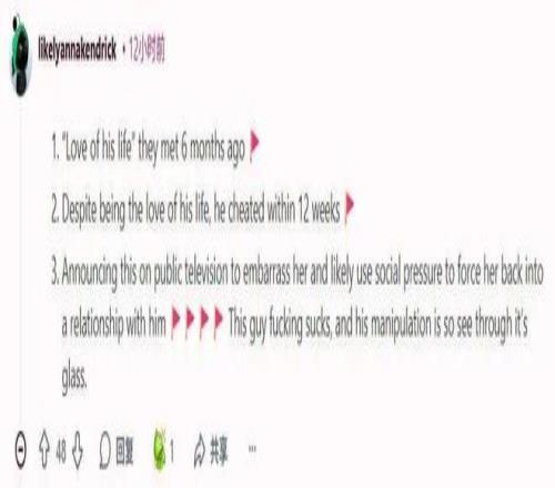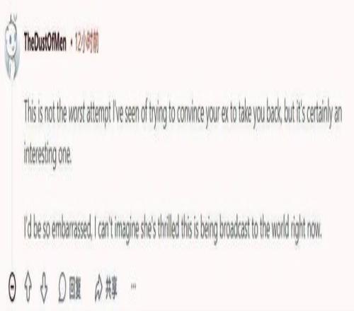 他揭露宣告这件事,让她尴尬,很或许是想使用社会舆论压力逼她回到他身边。这家伙真是太烂了,他PUA的手法一眼就能看穿。”