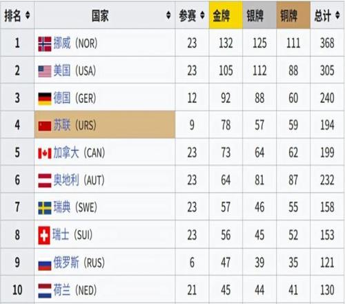 (冬奥会前史奖牌榜,图:Wiki)▼