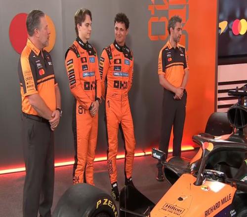 两位车手,兰多·诺里斯与奥斯卡·皮亚斯特里,以及车队负责人安德里亚·斯特拉与首席执行官扎克·布朗一起到会了发布会。