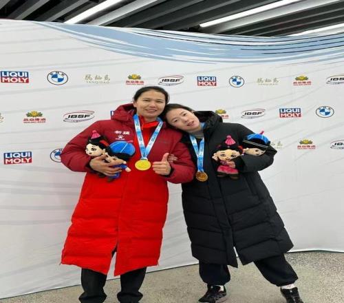 古丽洁乃提·阿迪克尤木(左)/赵佳颖在第十四届全国冬季运动会上摘得女子双人雪橇冠军。